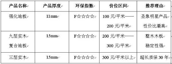 强化地板:其优点为泼辣抗造花色多,产品厚度在11mm左右,产品基材全部选自大亚,环保级别为F☆☆☆☆以及E0级。价位区间在100元/平米――200元/平米。
