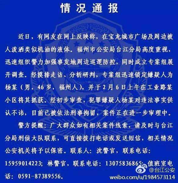 近日,有网友在网上反映称,在宝龙城市广场及周边被人泼洒类似机油的液体。福州市公安局台江分局高度重视,迅速组织警力加强事发地周边巡逻防控,同时成立专案组展开调查。经摸排走访、分析研判,专案组迅速锁定嫌疑人为杨某(男,46岁,福州人),并于2月6日上午在工业路某小区将其抓获。经初步审查,犯罪嫌疑人杨某对违法事实供认不讳,目前已被依法刑事拘留,案件正在进一步审理中。