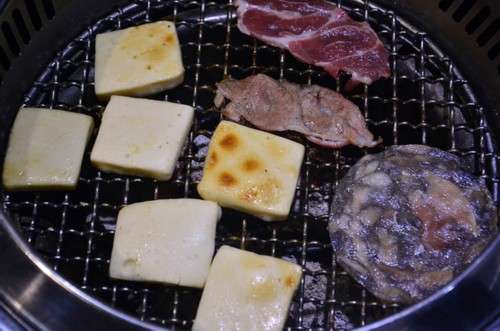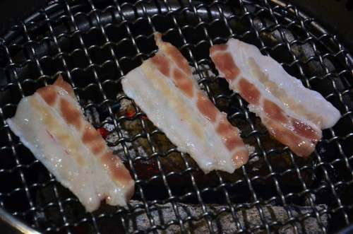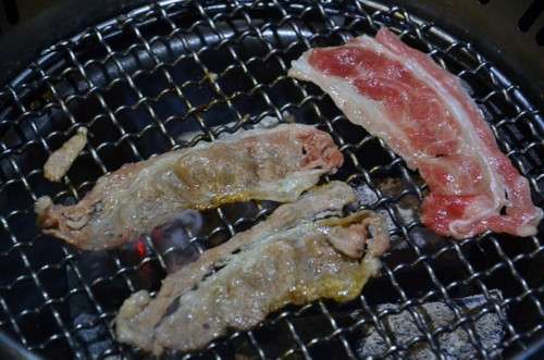 开始烤肉,炉子里面是烧红的木炭,上面是一层金属网,烤肉就在网上烤,这样油可以流下去,就不会吃到太多的油,比较健康。