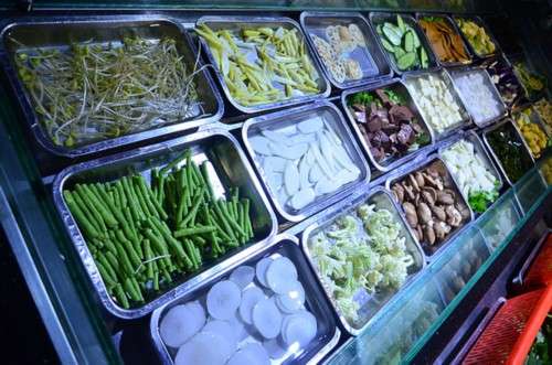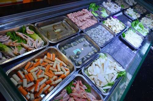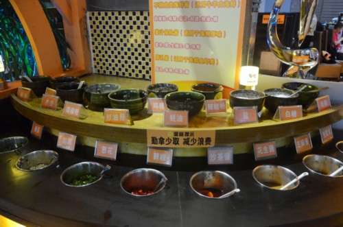 调料是自助的,品种挺多,可以按自己口味调制,墙上还贴心的写着什么食材适合配什么酱。