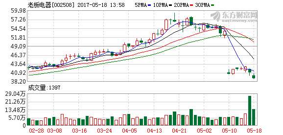 老板电器虽然5月16日小幅收涨,但截至5月17日收盘,报40.90元,下跌4.35%,盘中更是大跌逾6%。需要说明的是,老板电器当天成交金额11亿元,创下了上市以来的新高。