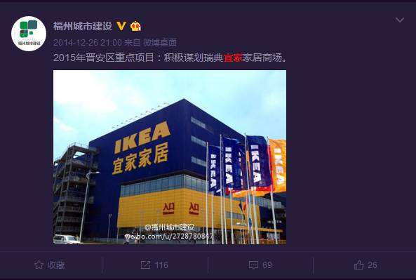 @福州城市建设发布微博称2015年晋安区重点项目:积极谋划瑞典宜家家居商场。