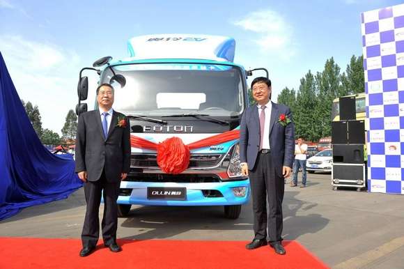 【中国物流与采购联合会副会长蔡进先生与福田商用汽车集团副总裁、轻型商用车业务总监赵建民先生为福田奥铃EV纯电动超级轻卡新品揭幕】