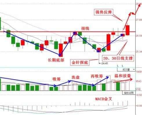 股价从高位下跌,在底部形成双重底反转形态,随后开始打压洗盘清洗获利盘,并且在右肩进行第二阶段建仓期,从而主力持有大量筹码。现在持续温和放量的大阳线突破双重底颈线,20、30日线支撑,macd金叉,说明上涨趋势形成。而且今天主力逆势拉阳说明主力实力雄厚,高度控盘,主力拉升意愿强烈。