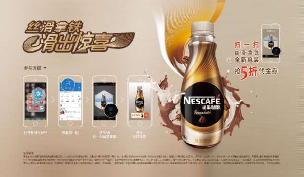 全新丝滑拿铁除了给人带来愉悦的惊喜口感外,意料之外的是,竟然还联手支付宝AR红包重新定义惊喜的新高度:用支付宝扫一扫丝滑拿铁全新包装瓶子,即可获得意想不到的5折代金券惊喜。