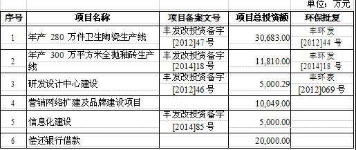 1.年产\u00A0280\u00A0万件卫生陶瓷生产线,项目总投资额30,683.00万元;2.年产\u00A0300\u00A0万平方米全抛釉砖生产线,项目总投资额11,810.00万元;3.研发设计中心建设,项目总投资额5,000.29万元;4.营销网络扩建及品牌建设项目,项目总投资额10,049.00万元;5.信息化建设,项目总投资额5,000.00万元;6.偿还银行借款,项目总投资额20,000.00万元。\u00A0