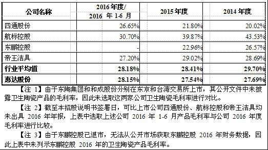 据惠达卫浴招股书显示,公司2014年至2016年综合毛利率分别为26.48%、26.10%、27.37%。同行业可比公司分别为东陶集团、和成股份、海鸥卫浴、帝王洁具、航标控股、东鹏控股、四通股份。\u00A0