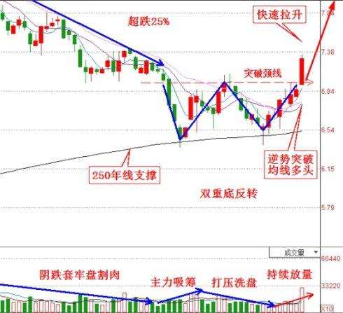 股价从高位超跌25%,在低位形成双重底反转形态,明显受到年线支撑。因为主力要低成本大量持股,所以之后马上打压洗盘,清洗获利盘和不坚定散户,提高了筹码稳定性。