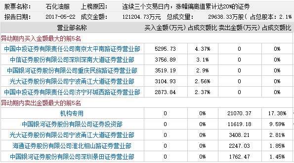 石化油服(行情600871,诊股)为油改概念股,今日强势涨停,机构席位卖出2.11亿,按照涨停价计算卖出5158万股,按照此股份应该是前十大股东卖出,但不能确定是那家。