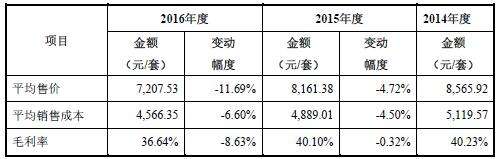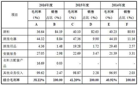最新招股书说明书显示,2013年至2016年,公司综合毛利率分别为45.52%、40.91%、41.20%和38.11%。此外,厨柜产品平均单价逐年下滑。2012年至2016年,厨柜产品平均单价分别为9,549.26元/套、9,355.15元/套、8,565.92元/套、8,161.38元/套、7,207.53元/套。