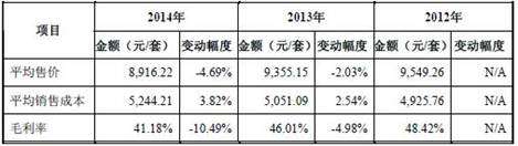 此外,厨柜产品平均单价逐年下滑。2012年至2016年,厨柜产品平均单价分别为9,549.26元/套、9,355.15元/套、8,565.92元/套、8,161.38元/套、7,207.53元/套。