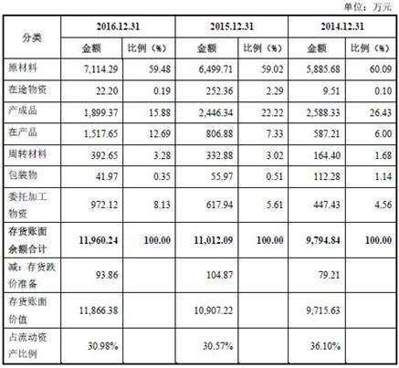 公司期末存货余额较大,主要由原材料、产成品构成。2014年至2016年,上述两项合计占存货余额的比例分别为86.52%、81.24%和75.36%。