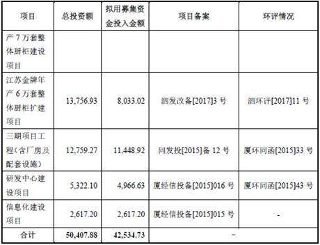 中国经济网编者按:2017年5月12日,厦门金牌厨柜股份有限公司(以下称“金牌厨柜”,股票代码603180)在上交所挂牌上市。金牌厨柜本次发行数量为1,700万股,保荐机构为兴业证券。金牌厨柜上市募集资金总额为47,345万元;扣除发行费用后,募集资金净额为42,534.73万元,分别用于“江苏金牌年产7万套整体厨柜建设项目”、“江苏金牌年产6万套整体厨柜扩建项目”、“三期项目工程(含厂房及配套设施)”、“研发中心建设项目”和“信息化建设项目”。