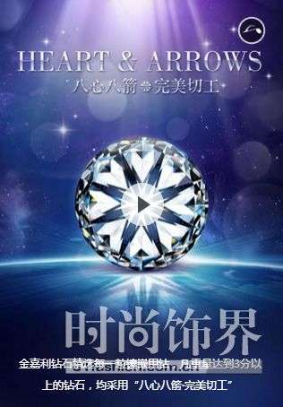 金嘉利钻石精选每一粒镶嵌用钻,凡重量达到3分以上的钻石,均采用“八心八箭完美切工”