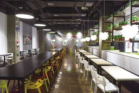 据谭萍介绍,重庆广告产业园的餐厅相较于其他几家门店,做了很多改变。“这里有2000多㎡,从装修设计到经营模式我们都做出了一些创新。”谭萍说,创意公园的员工餐厅融入了绿色环保的理念,营造一种舒适的用餐环境。