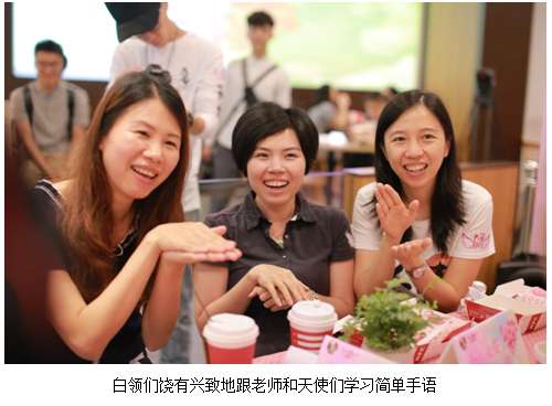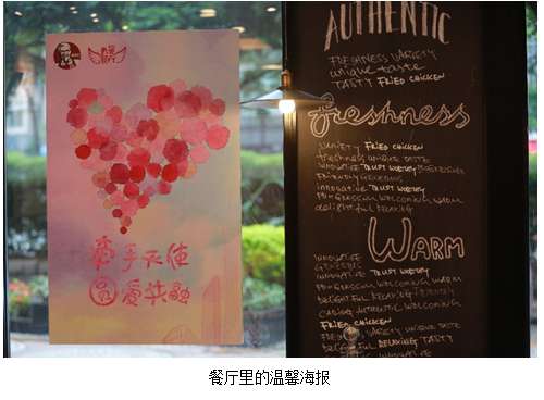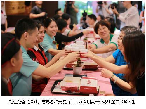 广州东峻广场有一家美丽的“天使餐厅”,这里半数以上的全职员工为听障、智障等特障人士,这些“天使”在特殊改装过的餐厅,体贴周到地为顾客服务。在5月21日全国助残日期间,作为为特障人士搭建实现自我价值的平台,肯德基广州“天使餐厅”联合广州市残疾人联合会和共青团广州市委员会,举办了一场倡导“残健共融”的“牵手天使,圆爱共融”体验活动:“天使员工”等特障朋友与普通白领、志愿者一起通过早餐会、艺术融合等形式,平等交流,倡导助残公益“人人平等、人人可为”的理念,促进“残健共融”。