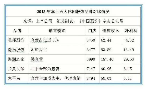 招商证券研究员孙妤此间认为,太平鸟在品牌发展存在梯度,具备滚动式发展潜力,在行业集中度逐渐提升的过程中,不断完善自身的设计研发能力和营销网络,有助于巩固并提升市场地位。而就产品定位和销售规模等情况来看,在本土中端休闲服饰领域中,美邦服饰、森马服饰、海澜之家、拉夏贝尔是太平鸟的主要竞争对手,除森马和海澜外,大多数公司均采用多品牌策略竞争国内成人休闲服市场,以拓宽市场规模,迎合不同人群的消费需求。截至2015年底,大部分中档休闲服装品牌门店数均在3000-4000家之间。其中,拉夏贝尔最多(7147家),森马单品牌3864家,太平鸟3794家,美邦服饰3750家,海澜之家单品牌3517家,太平鸟门店数量处于行业内平均水平。