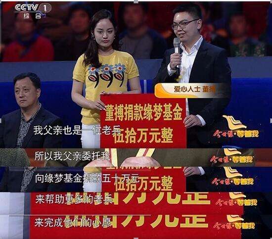 4月16日,中国唯一一档利用国家力量为普通大众实现“团圆梦”的大型服务类节目《等着我》最新一期在央视CCTV1-综合频道晚20:00播出。金伯利钻石集团总裁董搏先生代表金伯利钻石集团董事长董留生先生向栏目组爱心捐赠五十万元缘梦基金,帮助抗战老兵完成心愿,让爱不再等待。