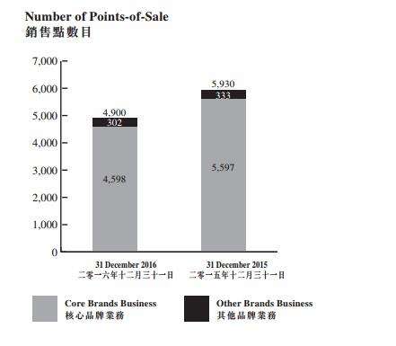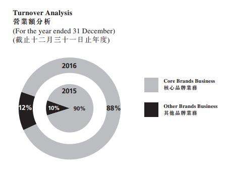 受销售点大幅减少及同店销售下降的影响,导致核心品牌业务营业额减少23.1%至59.36亿港元。2016年,核心品牌业务对外客户的收益占本集团总营业额88%。