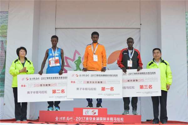央广网淮安4月16日消息(记者王延辉)第二届金湖农商行·2017淮安金湖国际半程马拉松赛今天(16日)上午8点30分在金湖荷花广场鸣枪开跑,有超过11000名来自全国乃至世界各地的马拉松爱好者再次齐聚金湖参与本次比赛,前世界冠军孙英杰担任领跑,经过激烈的角逐,最终来自埃塞俄比亚的选手分别获得男女组半程冠军。中国男子选手刘庆宝、陈山林分别夺得11点9公里赛的第二、第三名,肯尼亚男选手夺得这一项目赛的第一名。
