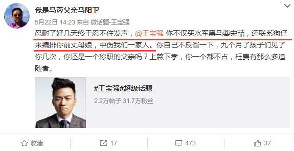 马蓉父亲曾经在5月22日下午两点多公开怼王宝强:忍耐了好几天终于忍不住发声,王宝强你不仅买水军黑马蓉宋喆,还联系狗仔来编排你前丈母娘,中伤我们一家人。你自己不反省一下,九个月了孩子们见了你几次,你还是一个称职的父亲吗?上慈下孝,你一个都不占,枉费有那么多追随者。