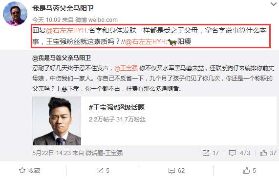 对于马蓉父亲如此恶心行为,有粉丝吐槽说他是阳痿。随后马蓉父亲转发该条评论呛声说:名字和身体发肤一样都是受之于父母,拿名字说事算什么本事,王宝强粉丝就这素质吗?