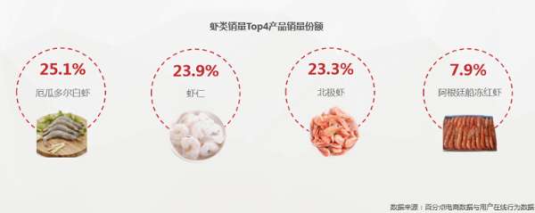 而水产类的采购分布非常广,由原来的本国采购,到买遍全球。例如生鲜水产中的虾类最为明显,电商中最畅销的4种虾占虾类总销量的80.1%,集中度高、来源广,这四种虾中,厄瓜多尔白虾、北极虾、阿根廷船冻红虾均为进口,消费者更愿意接受进口生鲜产品(见下表);