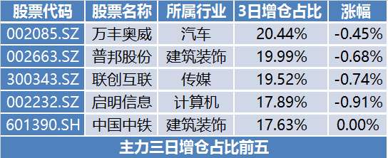 今日主力三日增仓排名中排名靠前的股票,剔除了近2月上市新股后,从主力近三日的资金流向上来看,万丰奥威(002085.SZ)三日增仓占比第一,今日3日增仓占比为20.44%,3日增仓占比变化最大;从所属行业情况看,主力偏好建筑装饰行业。