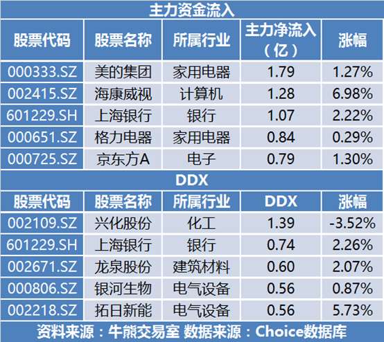 截至6月1日11时10分,主力资金流入和DDX(主力买入净量占流通盘比例)排名前五的个股(已剔除近2个月上市新股)中,主力流入最多的个股为美的集团(000333.SZ),主力净流入达1.79亿;从所属行业看,今日主力偏好家用电器行业;从DDX排行榜看,排行第一的为兴化股份(002109.SZ),DDX为1.39,盘中无涨停个股。