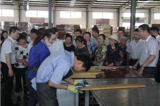 在实木地板坯料存放车间,来安工厂接待人员向妈妈们解说扬子地板对进口原材坯料的人工精选过程。儿子们也向妈妈们说明她们看到的坯料出自哪些树种、进口自哪些国家,一下子打来了妈妈们对实木的好奇心。