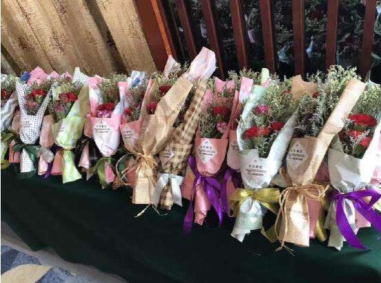 市场后勤人员在宴会厅电梯前迎接,并准备了康乃馨献给各位妈妈