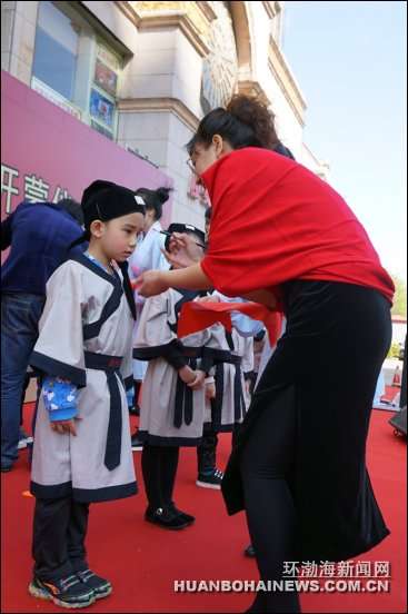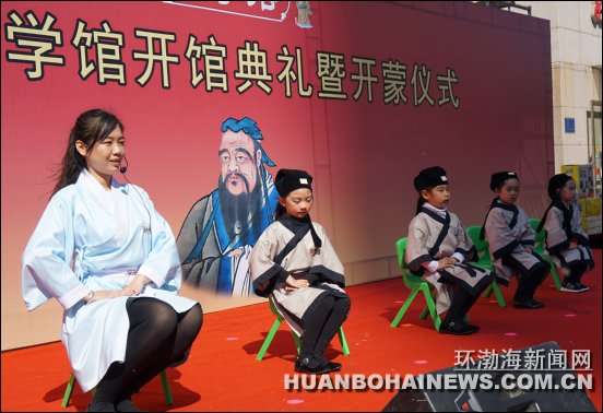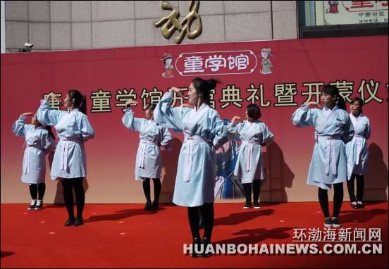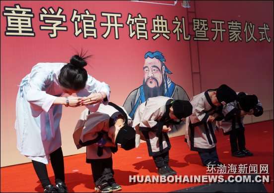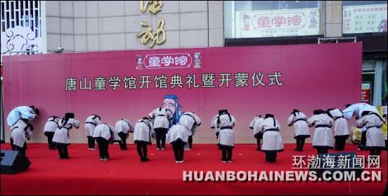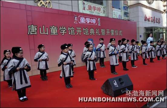 环渤海新闻网消息 (焦宇)4月17日,唐山首家童学馆在建设路上的唐山妇女儿童活动中心开馆。该馆提倡以创新之法向3至8岁儿童传承中国传统文化。开馆当天,20名幼儿在4名女“先生”的身教下,着汉服、拜孔子、诵国韵、习礼仪,分别完成了“师正衣冠”“集体拜孔”“平步青云”“朱砂开智”“开笔写字”“分发竹简”“分食聪明蛋”和“启蒙教育”八个步骤的开蒙礼。据悉,他们将在每个周末接受中华传统文化的熏陶。