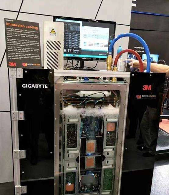 而在技嘉展台,就是完全不一样的场景了,什么10万元的主机都不是事,因为技嘉都在用主机“烧开水”了。目前常见的水冷都是水冷液经过散热片进行散热,都是金属接触式热传导,只不过改善了热传导的效率,而技嘉的这台主机,完全是开辟了新的道路,当然这肯定不是水,而是来自3M的NOVEC绝缘冷却液,其沸点较低,因此看起来虽然像开水一样沸腾。
