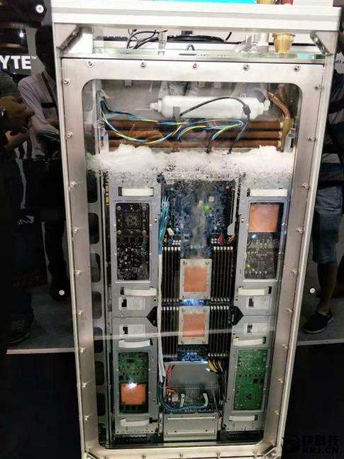 可以看到,整个主机都是泡在冷却液中,而且CPU、GPU并没有像传统主机那样安装鳍片散热器或水冷头,而是直接通过铜片将热量直接传导到液体中,冷却液不断的沸腾到顶部后又冷凝回流。真是有点像人体的血液,通过不断的回流带走各个部件的热量,这样的直接接触式散热效率将大大提高,不过想用的话还是再等等吧。