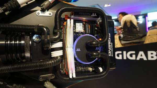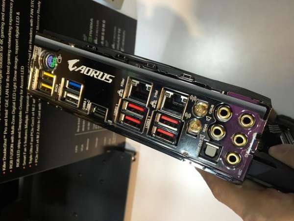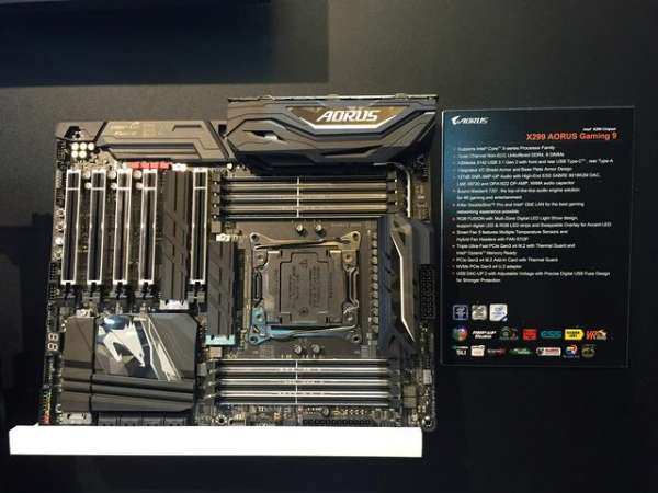 除了这个超级水冷主机,技嘉展台还连发了几款X299主板,都是技嘉高端AROUS品牌旗下的产品。其中X299 AORUS Gaming 9更是旗舰中的产品,配置了新的LGA 2066处理器插槽,支持的i9处理器,并且8条内存插槽支持4通道内存。在PCI-E3.0插槽上,也是尽可能满足高端玩家双卡的需求,第一条和第二条插槽之间预留出较大的空隙。其他方面就是提供了两个M.2 SSD插槽,并带有装甲散热。