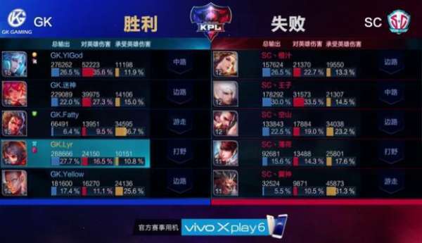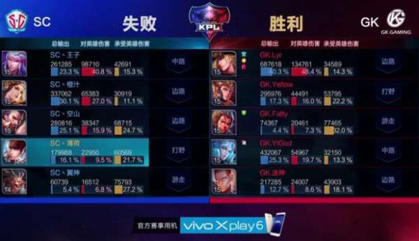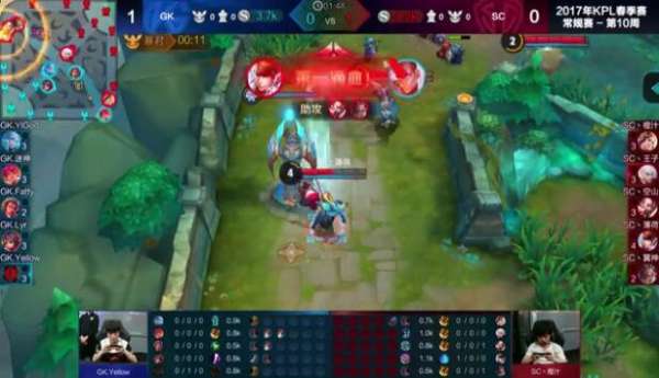 中期:11分21,曹操又一次被单抓,花木兰开启重剑打到嬴政,李元芳收下其人头,随后GK直接带着兵线压进,由于经济差距太大,SC接连被GK带走,随后在主宰兵的掩护下,GK一波推掉SC水晶。