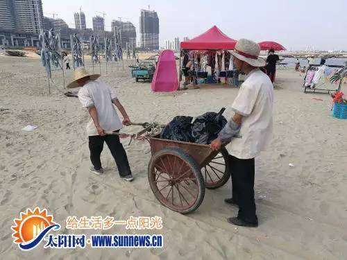记者看到,沙滩上十几名穿着和网上曝光图片同款制服的工作人员正拿着铲子、钳子、黑色垃圾袋,推着车,挖垃圾。