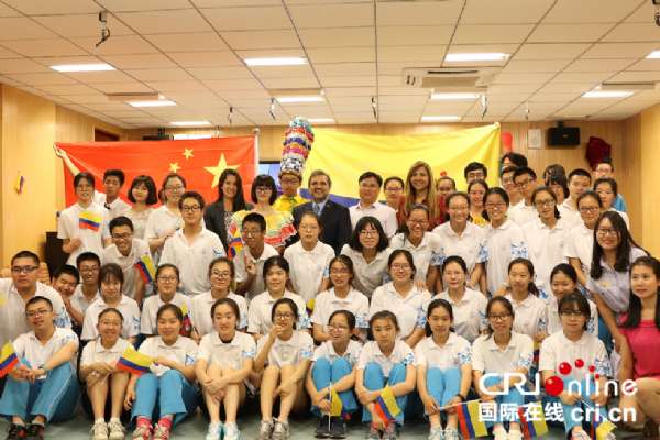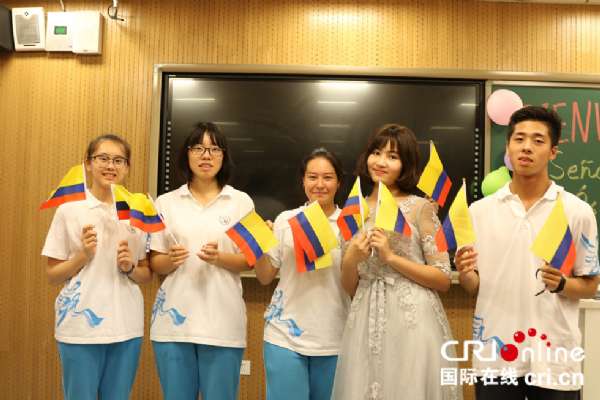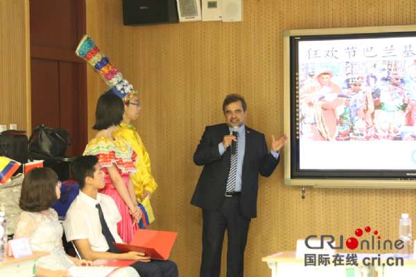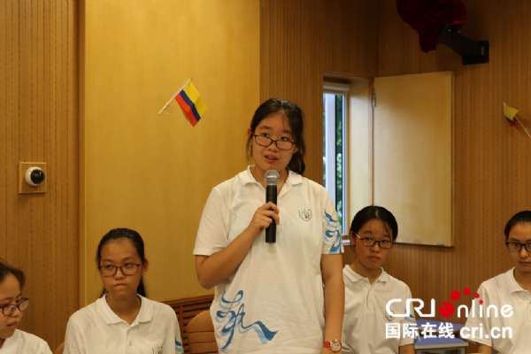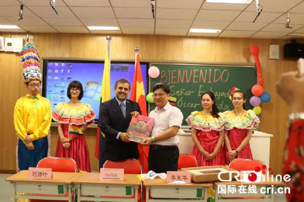 国际在线报道(中国国际广播电台记者 杨喆):5月31日,哥伦比亚大使奥斯卡?鲁埃达应邀来到北京古城中学,为古城中学西班牙语班的学生带来了一场生动的哥伦比亚文化盛宴。为了迎接大使的到来,同学们用气球和哥伦比亚国旗布置会场,身着哥伦比亚巴兰基亚地区的传统服饰,挥舞起手中的哥伦比亚国旗对大使表示热烈欢迎。