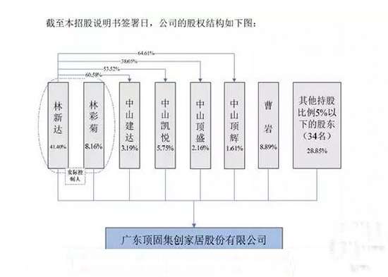 根据招股书,顶固集创实际控制人为林新达、林彩菊夫妇。林新达直接持股41.40%,通过中山建达、中山凯悦、中山顶盛、中山顶辉间接持股6.87%,林彩菊直接持股8.16%,夫妻二人共计持股56.43%。