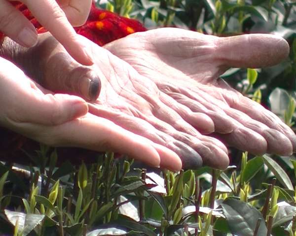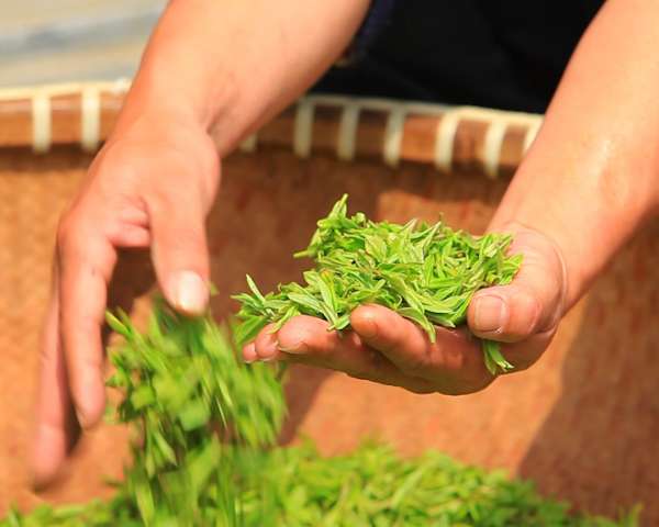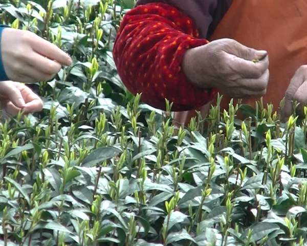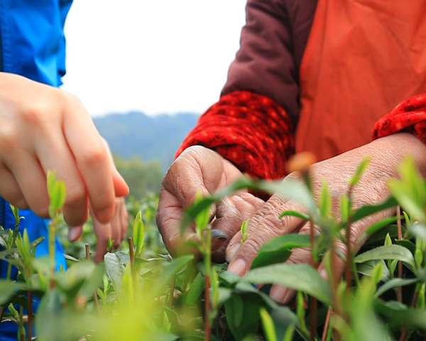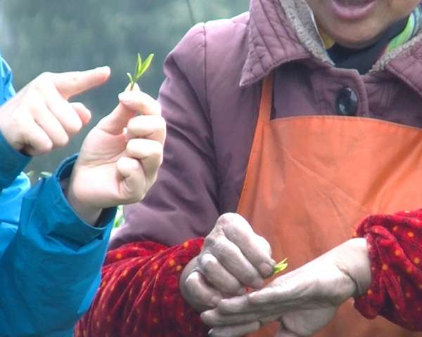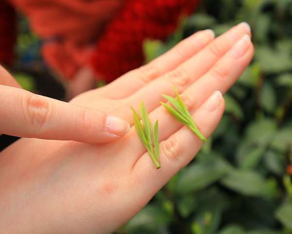 采茶绝对是个功夫,手要向上提,茶芽在手里不能紧握,放到篮里还不能颠倒,必须保持鲜叶的新嫩度。