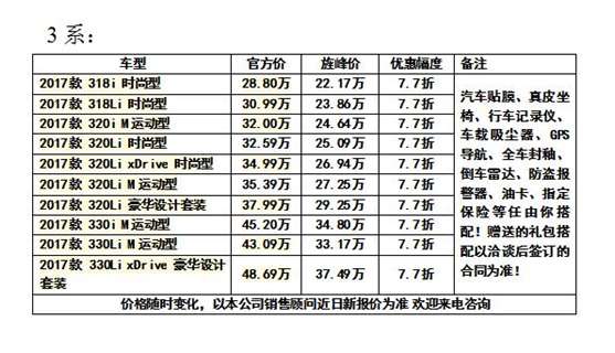 近日,车城社编辑从上海经销商处获得了独家的优惠促销信息,店内在售车型价格真心给力,买不了吃亏买不了上当。想要购车的消费者不妨来店内试驾看车,目前店内[ 宝马3系 宝马3系 了解更多> 指导价:28.80-48.69万 变速箱:手自一体 发动机:1.5T,2.0T 级 别:中型车 ]全系优惠促销。