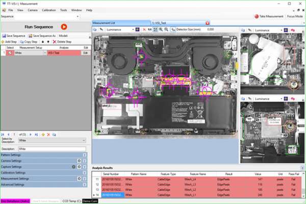 VIS-I系统软件基于Radiant经过现场广泛验证的TrueTest软件,拥有全面的检测工具库,可执行各种基本的机器视觉功能,来对机电组件进行验证和测量。这些工具可确保设备及其部件的制造精度(工具包括定位、测量、存在/缺失、边线检测、测量等)。通过充分利用高分辨率、高动态范围以及基于亮度计评估最小可觉差(JND)功能,VIS-I还能够执行表面检测,识别刮痕、压痕、点和异物等异常缺陷。VIS-I利用基于亮度计的梯度和对比度评估,来定位和识别整个图像中的对比度异常性,从而能够检测到传统机器视觉系统可能会忽视的细微缺陷,避免所装配的设备出厂后由此引起潜在故障。