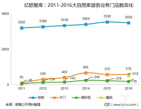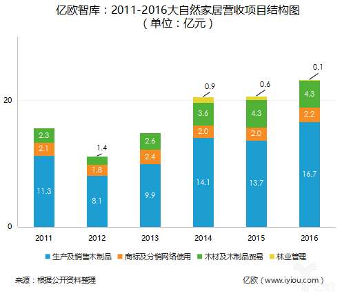 距离大自然发布大家居战略已有6年之久,从大自然每年披露的财报来看,除了地板产品仍保持不错的增长速度,其他产品木门、橱衣柜及壁纸仍处于初期发展阶段,财报中也并未列出各个品类的营收状况。从以下图表中了解,2011-2016年大自然整体业务发展比较稳定,2016年大自然「生产及销售木制品」即地板、木门、橱衣柜、壁纸等产品总营收16.7亿元,在大自然整体业务占比71.9%,其中地板收入为15.8亿元,在「生产及销售木制品」中占比超过94.6%,间接地说,其他家居产品木门、橱衣柜等业务占比低于6%。