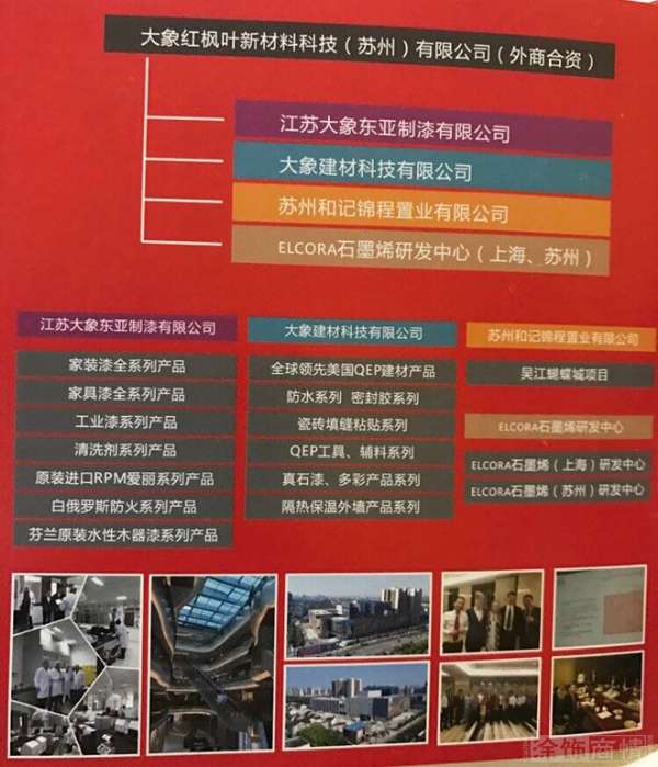 在宣传资料中,大象红枫叶却被描述为“中加合资”(“加”指加拿大)。其表示,2017年,“公司将组建全新的架构,新成立中加合资的大象红枫叶新材料科技(苏州)有限公司为母公司,大象制漆(江苏大象东亚制漆有限公司)、大象建材(大象建材科技有限公司)、大象房产(苏州和记锦程置业有限公司)三大子公司。”