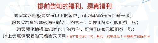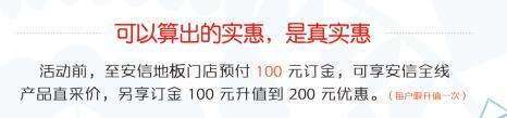 据了解,此次直采日活动中,不仅二翅豆等爆款产品开启促销活动的序幕,还有三重优惠好礼感恩回馈,一重好礼:在活动前,至安信地板门店预付100元定金,在购买产品时,立享定金100元升值200元优惠并享受安信全线产品直采价。二重好礼:在购买实木地板,实木复合地板和强化地板时满50m2 以上的用户,可使用300-500元不等金额抵扣券一张;三重好礼:在活动现场中,在购买地板的同时选购安信木门的用户,可享木门订单9.5折优惠,并配送五金等配件和安装等服务。