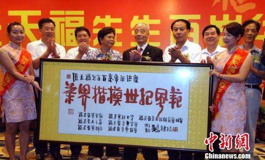 6月4日9时22分,中国知名茶学家、制茶和审评专家张天福在福州逝世,享年108岁。图为2008年9月17日,中国茶界泰斗张天福百岁华诞庆典在福州举行。福建省茶界人士向张天福(左五)赠匾贺寿。(资料图片) 记者刘可耕 摄