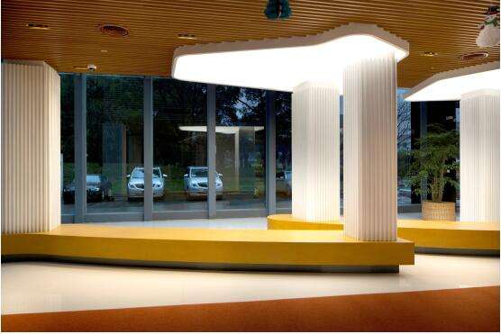 大堂作为公司的门面,在光线条件有限情况下,欧普商照通过光影运用在较小空间内、制造明暗变化,并利用发光膜点缀柱子,明亮度对比强烈,形成很强的视觉冲击力。