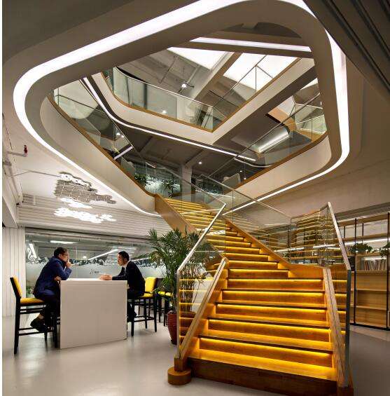 在旧厂房改造的过程中,欧普商用照明极力发挥其个性定制能力、满足企业不同空间的照明需求。华人照明设计师联合会(CLDA)谢茂堂会长在参观诺亚财富总部后表示:“国内利用旧厂房改造办公空间,无论在设计手法、照明方式上,都会是一个趋势,诺亚财富在旋转楼梯处营造自然光,很符合照明产品个性定制化需求。”而这样的个性化定制在现场随处可见,比如欧普商照在天花板覆盖了一层光照层,这样就可以提升空间的高度。