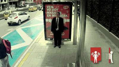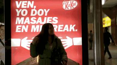 KitKat,可以给人按摩的广告牌。内有传感驱动装置,人一靠近就会运转,等公交无聊了,哪里酸痛蹭哪里~