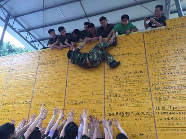 \u00A0 \u00A0 最后一个项目挑战,成为了本轮拓展的重头戏,翻越4.2米毕业墙。眼前一道光溜溜的墙面,单凭男生个人力量优势,也绝对难以在几分钟的时间内翻越,何况还要在女生占大半数,过程不能交流的前提下,实现所有人员成功翻越的挑战,队里所有人员心里似乎都没有底,但在面对一次次的挑战失败后,浪鲸人始终坚持不懈,最终以短短几分钟的时间完成了挑战。